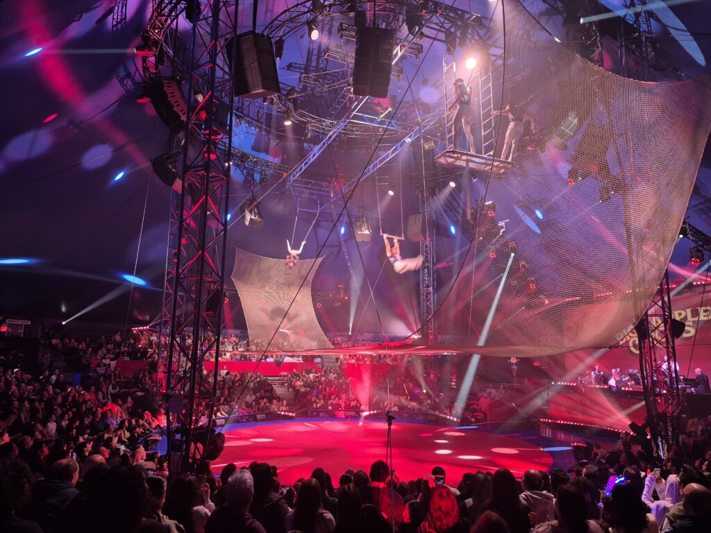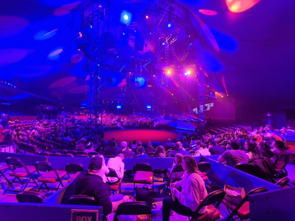 Vrijdagavond 7 november 2025, met een Vip kaartje voor de première in de hand sta ik voor het mooie Big Apple Circus wat de tenten voor het 48e jaar heeft opgebouwd, deze keer weer naast het Lincoln Center. Na een wat rommelig ontvangst, warme cola en koude hotdogs in de koele en niet heel sfeervolle Vip tent kwam ik aan in de prachtig verlichte voortent. Hier was echte circus sfeer met een mooie verkoopstand voor popcorn, snacks, merchandise en fotohoek.